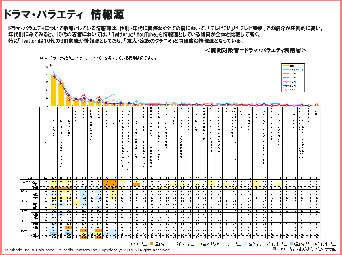 ドラマ・バラエティについて参考としている情報源は、性別・年代に関係なくすべての層において、「テレビCM」と「テレビ番組」での紹介が圧倒的に高い。