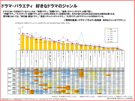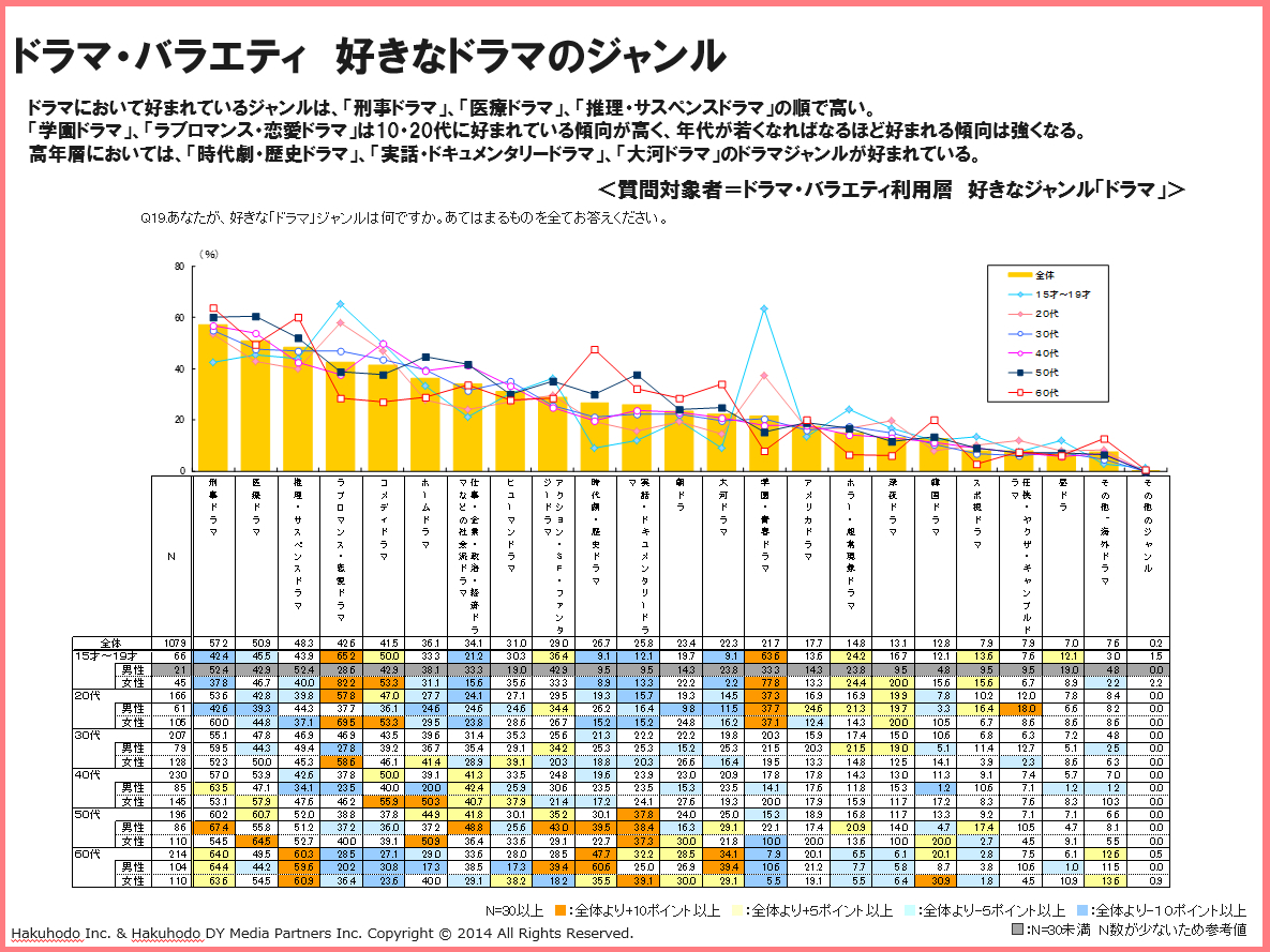 「学園ドラマ」、「ラブロマンス・恋愛ドラマ」は10・20代に好まれている傾向が高く、年代が若くなればなるほど好まれる傾向は強くなる。