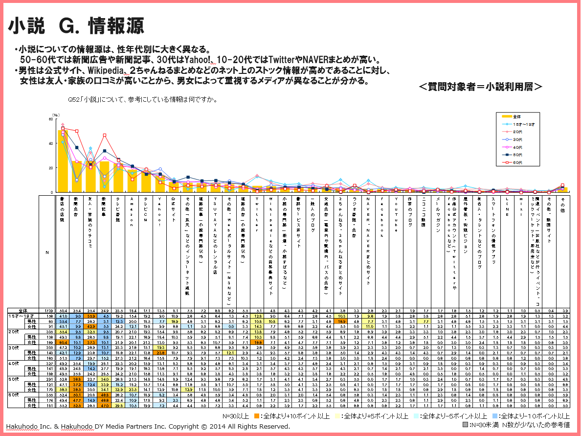 ・男性は公式サイト、Wikipedia、2ちゃんねるまとめなどのネット上のストック情報が高めであることに対し、女性は友人・家族のクチコミが高いことから、男女によって重視するメディアが異なることが分かる。