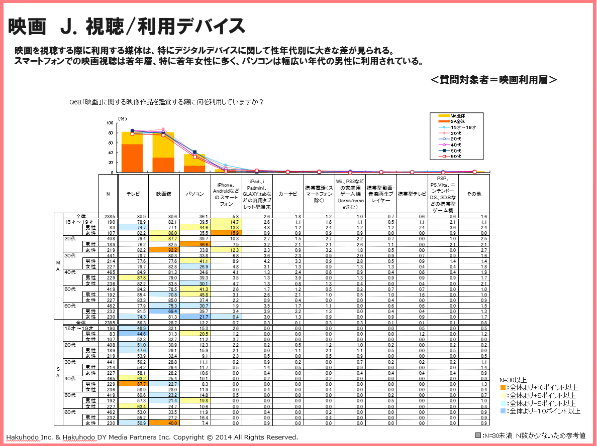 スマートフォンでの映画視聴は若年層、特に若年女性に多く、パソコンは幅広い年代の男性に利用されている。